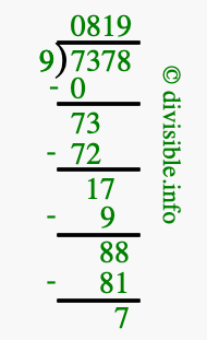 The image displays 819 at the top, which is the quotient, and 7 at the bottom, which is the remainder. Therefore, the answer to 7378 divided by 9 (7378 ÷ 9) using long division is 819 remainder 7, or simply 819 R 7.