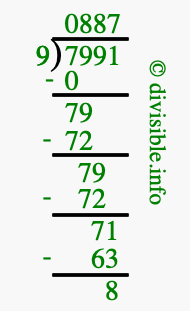 The illustration below shows you how to calculate 7991 divided by 9 using long division. As you can see, the dividend value of 7991 is located to the right of the "⟌" and the divisor value of 9 is located to the left of the "⟌".