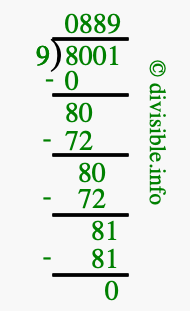 The image displays 889 at the top, which is the quotient, and 0 at the bottom, which is the remainder. Therefore, the answer to 8001 divided by 9 (8001 ÷ 9) using long division is 889 remainder 0, or simply 889 R 0.