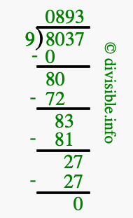 Here we will show you an image that illustrates how to calculate 8037 divided by 9 using long division. We will also give you the answer to 8037 divided by 9 (8037 ÷ 9) as a fraction and as a decimal.