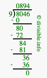 The image displays 894 at the top, which is the quotient, and 0 at the bottom, which is the remainder. Therefore, the answer to 8046 divided by 9 (8046 ÷ 9) using long division is 894 remainder 0, or simply 894 R 0.