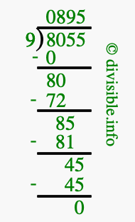 Here we will show you an image that illustrates how to calculate 8055 divided by 9 using long division. We will also give you the answer to 8055 divided by 9 (8055 ÷ 9) as a fraction and as a decimal.