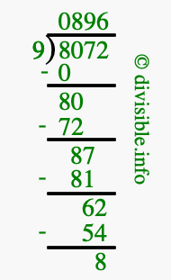 Here we will show you an image that illustrates how to calculate 8072 divided by 9 using long division. We will also give you the answer to 8072 divided by 9 (8072 ÷ 9) as a fraction and as a decimal.