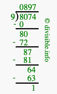 The image displays 897 at the top, which is the quotient, and 1 at the bottom, which is the remainder. Therefore, the answer to 8074 divided by 9 (8074 ÷ 9) using long division is 897 remainder 1, or simply 897 R 1.