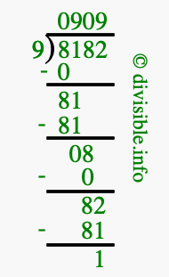 The image displays 909 at the top, which is the quotient, and 1 at the bottom, which is the remainder. Therefore, the answer to 8182 divided by 9 (8182 ÷ 9) using long division is 909 remainder 1, or simply 909 R 1.