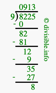 The image displays 913 at the top, which is the quotient, and 8 at the bottom, which is the remainder. Therefore, the answer to 8225 divided by 9 (8225 ÷ 9) using long division is 913 remainder 8, or simply 913 R 8.