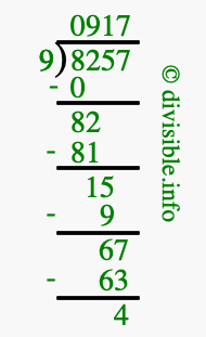 The image displays 917 at the top, which is the quotient, and 4 at the bottom, which is the remainder. Therefore, the answer to 8257 divided by 9 (8257 ÷ 9) using long division is 917 remainder 4, or simply 917 R 4.