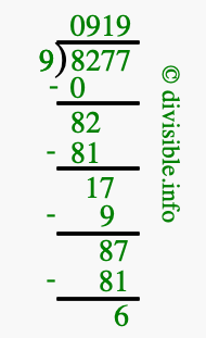 The image displays 919 at the top, which is the quotient, and 6 at the bottom, which is the remainder. Therefore, the answer to 8277 divided by 9 (8277 ÷ 9) using long division is 919 remainder 6, or simply 919 R 6.