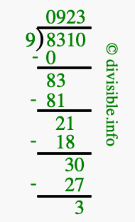 The image displays 923 at the top, which is the quotient, and 3 at the bottom, which is the remainder. Therefore, the answer to 8310 divided by 9 (8310 ÷ 9) using long division is 923 remainder 3, or simply 923 R 3.