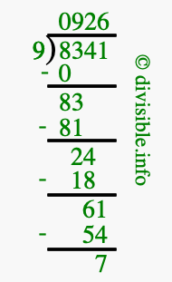 The image displays 926 at the top, which is the quotient, and 7 at the bottom, which is the remainder. Therefore, the answer to 8341 divided by 9 (8341 ÷ 9) using long division is 926 remainder 7, or simply 926 R 7.