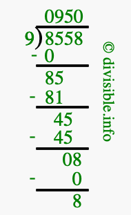 Here we will show you an image that illustrates how to calculate 8558 divided by 9 using long division. We will also give you the answer to 8558 divided by 9 (8558 ÷ 9) as a fraction and as a decimal.