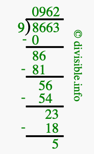 Here we will show you an image that illustrates how to calculate 8663 divided by 9 using long division. We will also give you the answer to 8663 divided by 9 (8663 ÷ 9) as a fraction and as a decimal.