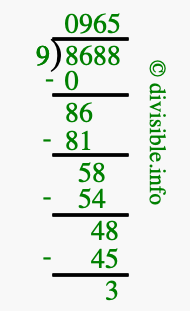 The image displays 965 at the top, which is the quotient, and 3 at the bottom, which is the remainder. Therefore, the answer to 8688 divided by 9 (8688 ÷ 9) using long division is 965 remainder 3, or simply 965 R 3.