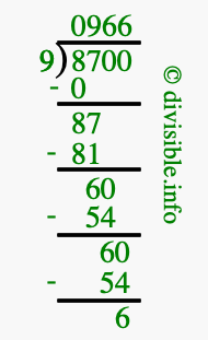 Here we will show you an image that illustrates how to calculate 8700 divided by 9 using long division. We will also give you the answer to 8700 divided by 9 (8700 ÷ 9) as a fraction and as a decimal.