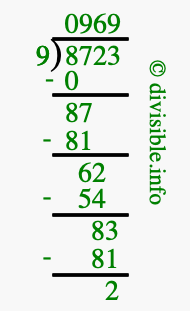 The image displays 969 at the top, which is the quotient, and 2 at the bottom, which is the remainder. Therefore, the answer to 8723 divided by 9 (8723 ÷ 9) using long division is 969 remainder 2, or simply 969 R 2.