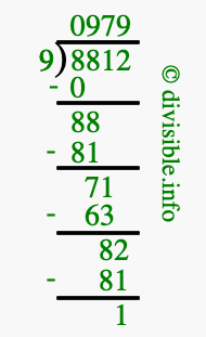 The image displays 979 at the top, which is the quotient, and 1 at the bottom, which is the remainder. Therefore, the answer to 8812 divided by 9 (8812 ÷ 9) using long division is 979 remainder 1, or simply 979 R 1.