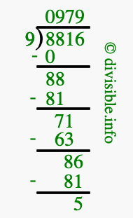 The image displays 979 at the top, which is the quotient, and 5 at the bottom, which is the remainder. Therefore, the answer to 8816 divided by 9 (8816 ÷ 9) using long division is 979 remainder 5, or simply 979 R 5.