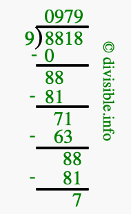 The image displays 979 at the top, which is the quotient, and 7 at the bottom, which is the remainder. Therefore, the answer to 8818 divided by 9 (8818 ÷ 9) using long division is 979 remainder 7, or simply 979 R 7.