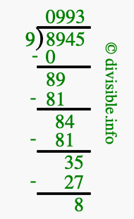 Here we will show you an image that illustrates how to calculate 8945 divided by 9 using long division. We will also give you the answer to 8945 divided by 9 (8945 ÷ 9) as a fraction and as a decimal.