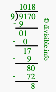 The image displays 1018 at the top, which is the quotient, and 8 at the bottom, which is the remainder. Therefore, the answer to 9170 divided by 9 (9170 ÷ 9) using long division is 1018 remainder 8, or simply 1018 R 8.
