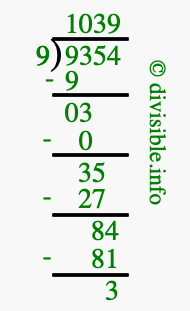 The image displays 1039 at the top, which is the quotient, and 3 at the bottom, which is the remainder. Therefore, the answer to 9354 divided by 9 (9354 ÷ 9) using long division is 1039 remainder 3, or simply 1039 R 3.