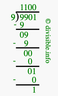 The image displays 1100 at the top, which is the quotient, and 1 at the bottom, which is the remainder. Therefore, the answer to 9901 divided by 9 (9901 ÷ 9) using long division is 1100 remainder 1, or simply 1100 R 1.