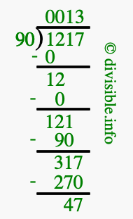 The image displays 13 at the top, which is the quotient, and 47 at the bottom, which is the remainder. Therefore, the answer to 1217 divided by 90 (1217 ÷ 90) using long division is 13 remainder 47, or simply 13 R 47.