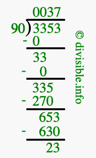 The image displays 37 at the top, which is the quotient, and 23 at the bottom, which is the remainder. Therefore, the answer to 3353 divided by 90 (3353 ÷ 90) using long division is 37 remainder 23, or simply 37 R 23.