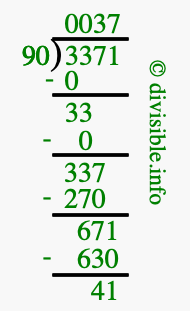 The image displays 37 at the top, which is the quotient, and 41 at the bottom, which is the remainder. Therefore, the answer to 3371 divided by 90 (3371 ÷ 90) using long division is 37 remainder 41, or simply 37 R 41.