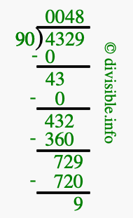 The image displays 48 at the top, which is the quotient, and 9 at the bottom, which is the remainder. Therefore, the answer to 4329 divided by 90 (4329 ÷ 90) using long division is 48 remainder 9, or simply 48 R 9.