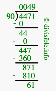 The image displays 49 at the top, which is the quotient, and 61 at the bottom, which is the remainder. Therefore, the answer to 4471 divided by 90 (4471 ÷ 90) using long division is 49 remainder 61, or simply 49 R 61.