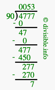The image displays 53 at the top, which is the quotient, and 7 at the bottom, which is the remainder. Therefore, the answer to 4777 divided by 90 (4777 ÷ 90) using long division is 53 remainder 7, or simply 53 R 7.