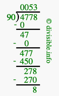 Here we will show you an image that illustrates how to calculate 4778 divided by 90 using long division. We will also give you the answer to 4778 divided by 90 (4778 ÷ 90) as a fraction and as a decimal.