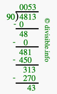 Here we will show you an image that illustrates how to calculate 4813 divided by 90 using long division. We will also give you the answer to 4813 divided by 90 (4813 ÷ 90) as a fraction and as a decimal.