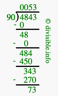 The image displays 53 at the top, which is the quotient, and 73 at the bottom, which is the remainder. Therefore, the answer to 4843 divided by 90 (4843 ÷ 90) using long division is 53 remainder 73, or simply 53 R 73.
