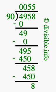 The image displays 55 at the top, which is the quotient, and 8 at the bottom, which is the remainder. Therefore, the answer to 4958 divided by 90 (4958 ÷ 90) using long division is 55 remainder 8, or simply 55 R 8.