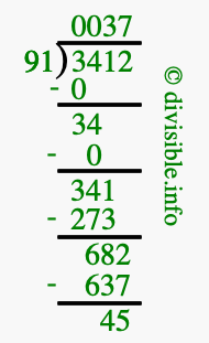 The image displays 37 at the top, which is the quotient, and 45 at the bottom, which is the remainder. Therefore, the answer to 3412 divided by 91 (3412 ÷ 91) using long division is 37 remainder 45, or simply 37 R 45.