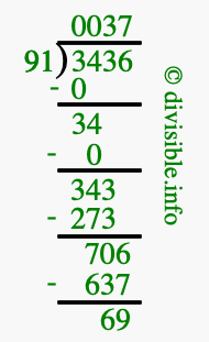 The image displays 37 at the top, which is the quotient, and 69 at the bottom, which is the remainder. Therefore, the answer to 3436 divided by 91 (3436 ÷ 91) using long division is 37 remainder 69, or simply 37 R 69.
