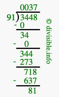 The image displays 37 at the top, which is the quotient, and 81 at the bottom, which is the remainder. Therefore, the answer to 3448 divided by 91 (3448 ÷ 91) using long division is 37 remainder 81, or simply 37 R 81.