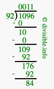 The image displays 11 at the top, which is the quotient, and 84 at the bottom, which is the remainder. Therefore, the answer to 1096 divided by 92 (1096 ÷ 92) using long division is 11 remainder 84, or simply 11 R 84.