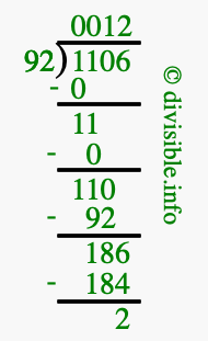 The image displays 12 at the top, which is the quotient, and 2 at the bottom, which is the remainder. Therefore, the answer to 1106 divided by 92 (1106 ÷ 92) using long division is 12 remainder 2, or simply 12 R 2.