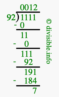 The image displays 12 at the top, which is the quotient, and 7 at the bottom, which is the remainder. Therefore, the answer to 1111 divided by 92 (1111 ÷ 92) using long division is 12 remainder 7, or simply 12 R 7.