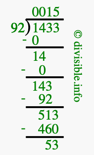 The image displays 15 at the top, which is the quotient, and 53 at the bottom, which is the remainder. Therefore, the answer to 1433 divided by 92 (1433 ÷ 92) using long division is 15 remainder 53, or simply 15 R 53.
