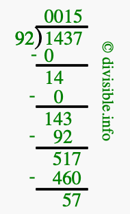 The image displays 15 at the top, which is the quotient, and 57 at the bottom, which is the remainder. Therefore, the answer to 1437 divided by 92 (1437 ÷ 92) using long division is 15 remainder 57, or simply 15 R 57.