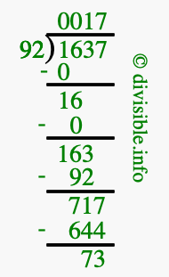 The image displays 17 at the top, which is the quotient, and 73 at the bottom, which is the remainder. Therefore, the answer to 1637 divided by 92 (1637 ÷ 92) using long division is 17 remainder 73, or simply 17 R 73.