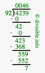 The image displays 46 at the top, which is the quotient, and 7 at the bottom, which is the remainder. Therefore, the answer to 4239 divided by 92 (4239 ÷ 92) using long division is 46 remainder 7, or simply 46 R 7.