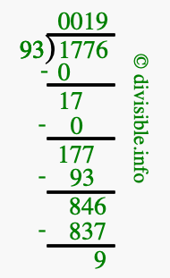 The image displays 19 at the top, which is the quotient, and 9 at the bottom, which is the remainder. Therefore, the answer to 1776 divided by 93 (1776 ÷ 93) using long division is 19 remainder 9, or simply 19 R 9.