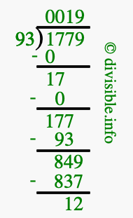 The image displays 19 at the top, which is the quotient, and 12 at the bottom, which is the remainder. Therefore, the answer to 1779 divided by 93 (1779 ÷ 93) using long division is 19 remainder 12, or simply 19 R 12.