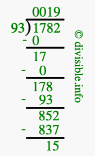 The image displays 19 at the top, which is the quotient, and 15 at the bottom, which is the remainder. Therefore, the answer to 1782 divided by 93 (1782 ÷ 93) using long division is 19 remainder 15, or simply 19 R 15.