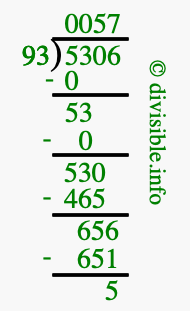The illustration below shows you how to calculate 5306 divided by 93 using long division. As you can see, the dividend value of 5306 is located to the right of the "⟌" and the divisor value of 93 is located to the left of the "⟌".